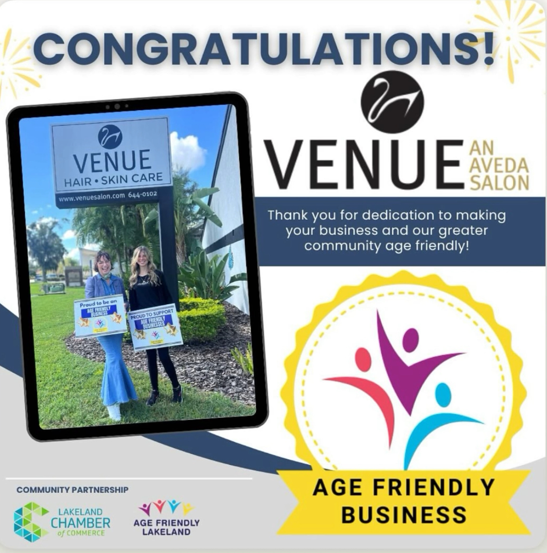 Venue Salon has been recognized by the Lakeland Chamber of Commerce as an age friendly business. The Lakeland Chamber of Commerce has partnered with Age Friendly Lakeland to recognize businesses that support older adults as they build their locations and train their staff. An “age-friendly” business considers the needs of older adults and creates a barrier-free environment that enables people of all ages and abilities to visit, shop and fully access the location’s spaces and use the offered services. Venue Salon & Spa has been awarded the certification as an Age friendly in Lakeland and we continue to strive to advocate for older adults and their families!